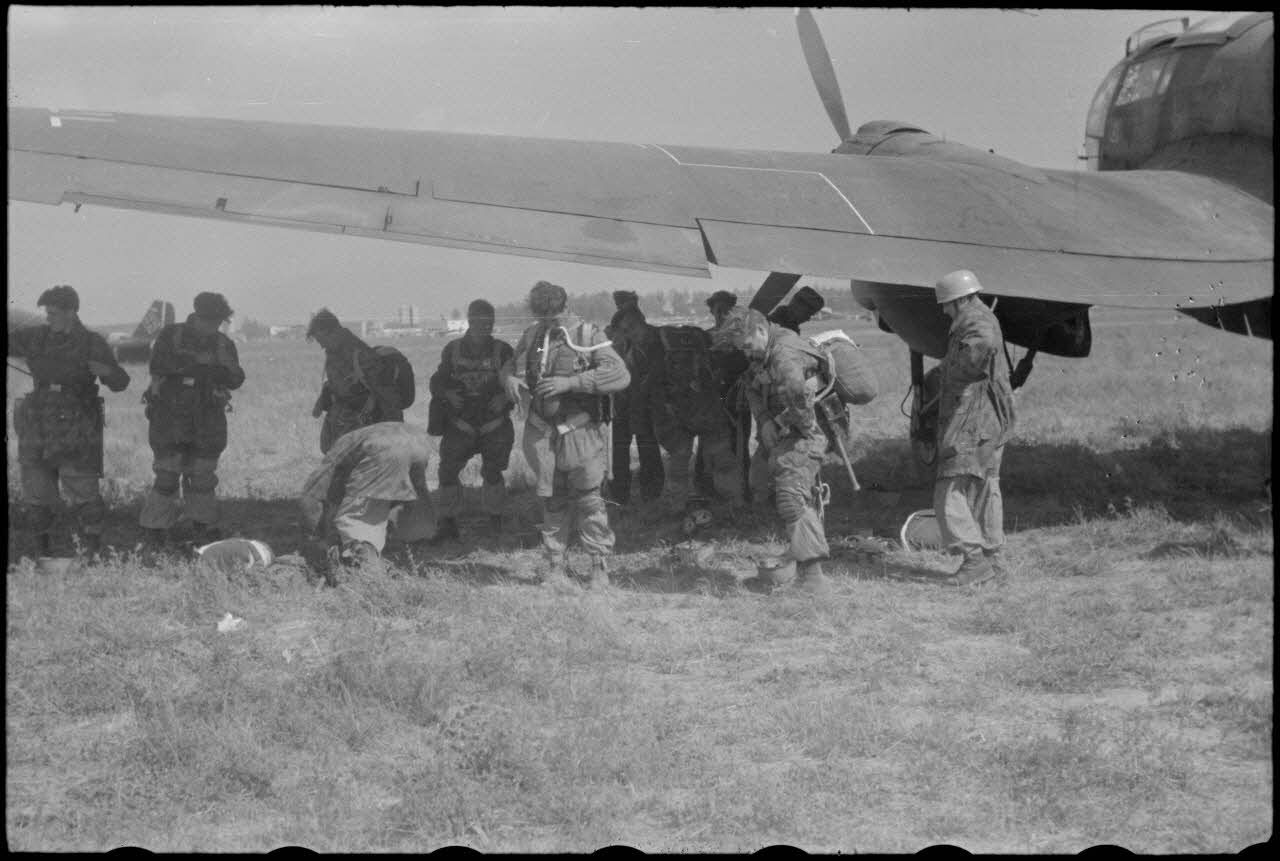 Sur le terrain d'aviation Naples-Pomigliano, des parachutistes de la 1.Fallschirm-Jäger-Division (1re division aéroportée allemande) s'équipent de leur parachute avant de monter à bord d'un Heinkel He-111.