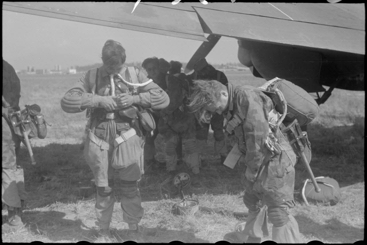 Des parachutistes de la 1.Fallschirm-Jäger-Division s'équipent de leur parachute avant de monter à bord des avions (Junkers Ju-52 et Heinkel He-111).
