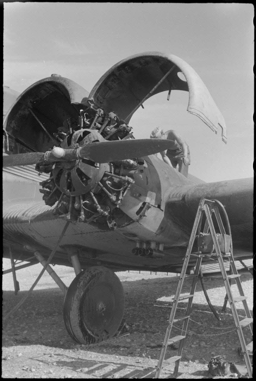 Sur le terrain de Corfou, la maintenance de moteurs BMW d'un avion Junkers Ju-52 du Transportgeschwader 4.