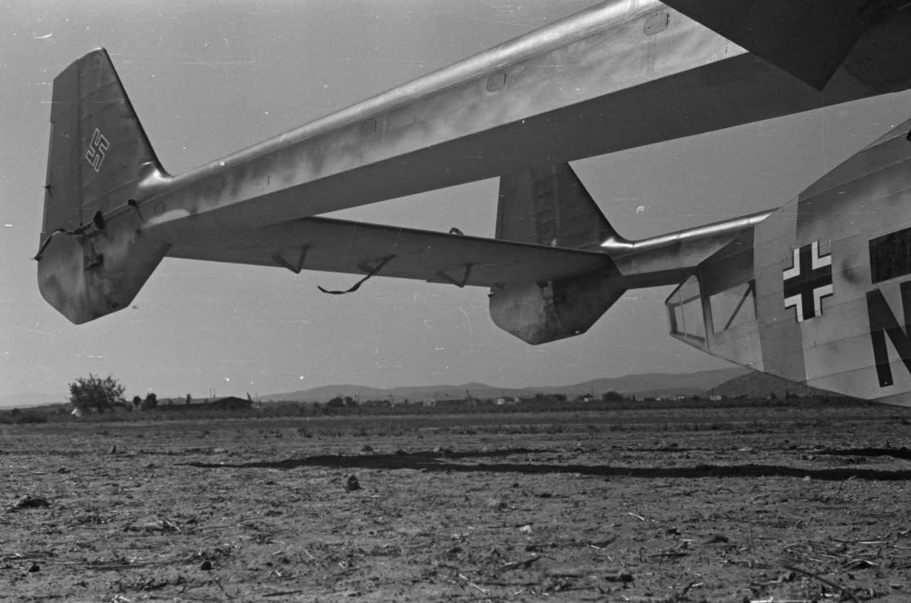 A Kastelli (Crète), au sein du Aufklärungs.Gruppe 123 (2./ Aufkl. Gr.123), la maintenance d'un Junkers Ju-88 peu avant une mission de remorquage d'un planeur Gotha Go-242.