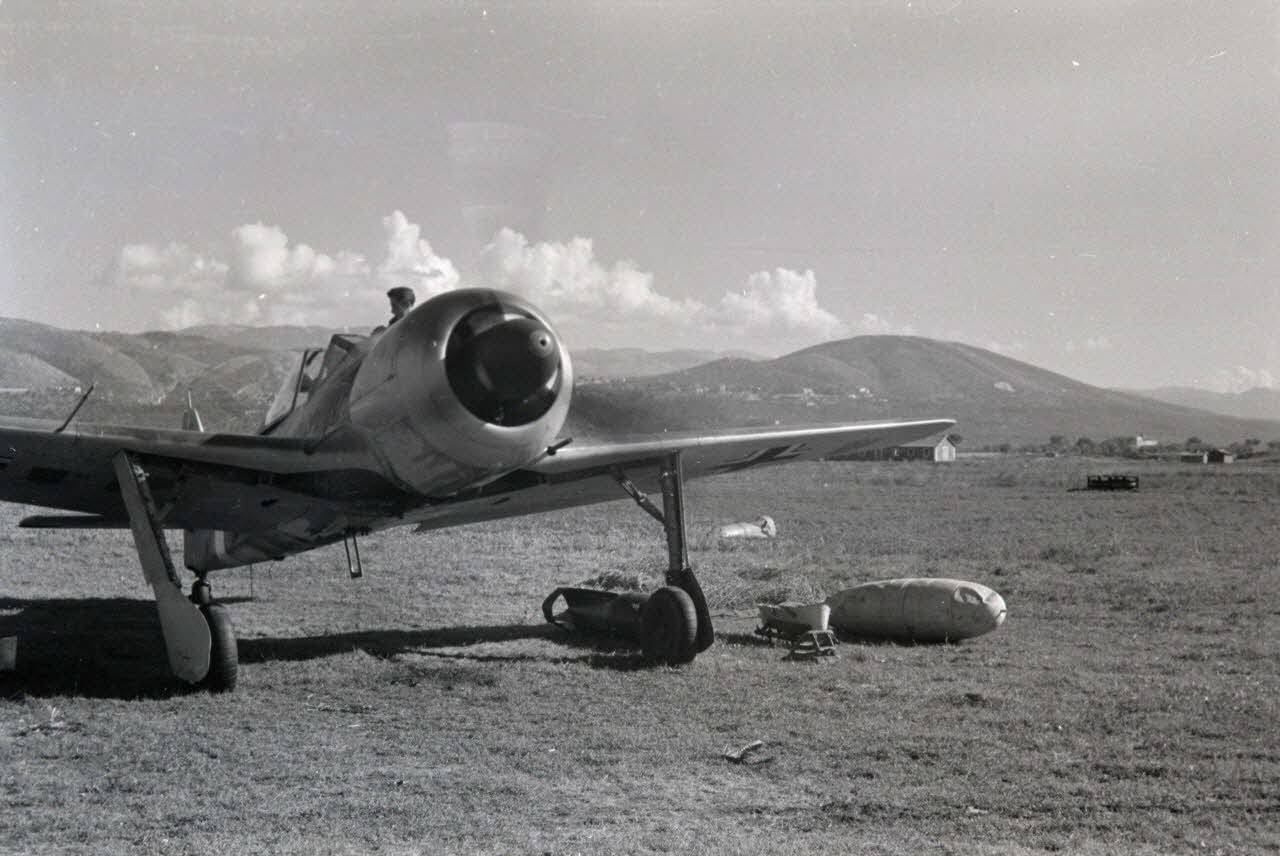 Sur le terrain de Guidonia Montecelio, un chasseur Focke-Wulf Fw-190 du Schlachtgeschwader 4 (I./SG4) s'apprête à décoller, le moteur BMW tourne déjà.