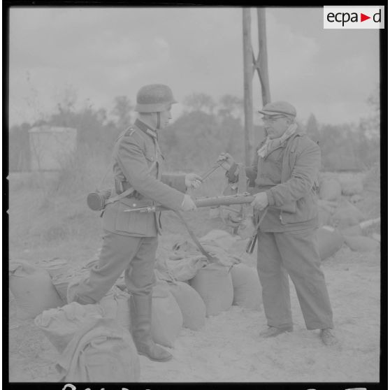 Sur le tournage du film Le jour le plus long. Un militaire allemand remet ses armes à un maquisard.