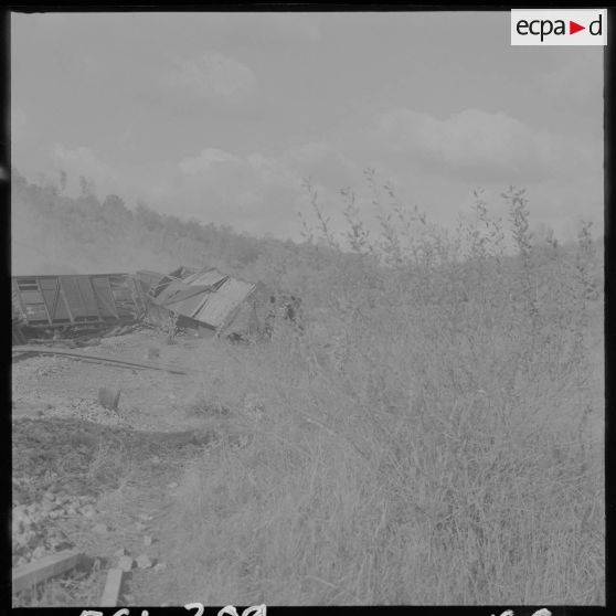 Sur le tournage du film Le jour le plus long. Mise en place du dispositif pour les prises de vues cinéma séquence : sabotage d'un train entre Louviers et Acquigny.