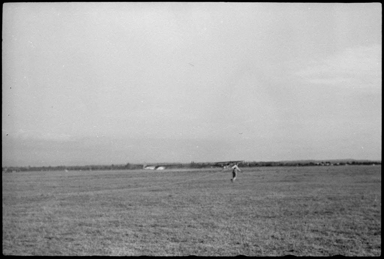 Sur terrain de Valence occupé par le Luftlandegeschwader 1, un décollage au loin d'un planeur tracté par un Henschel Hs-126.