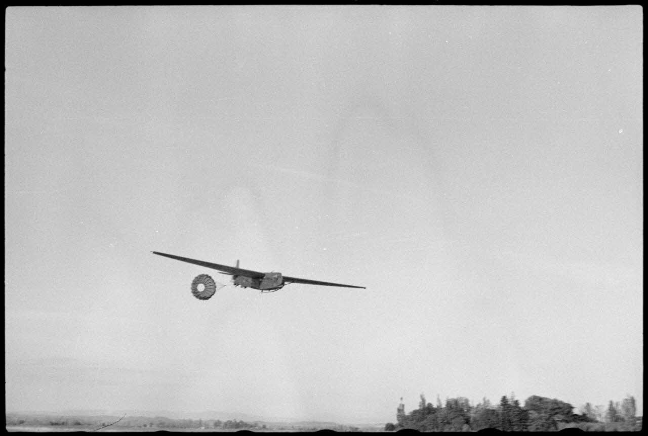 Sur le terrain d'aviation de Valence occupé par le Luftlandegeschwader 1, à l'issue d'un vol d'entraînement, pliage du parachute qui a freiné la descente du planeur DFS-230.