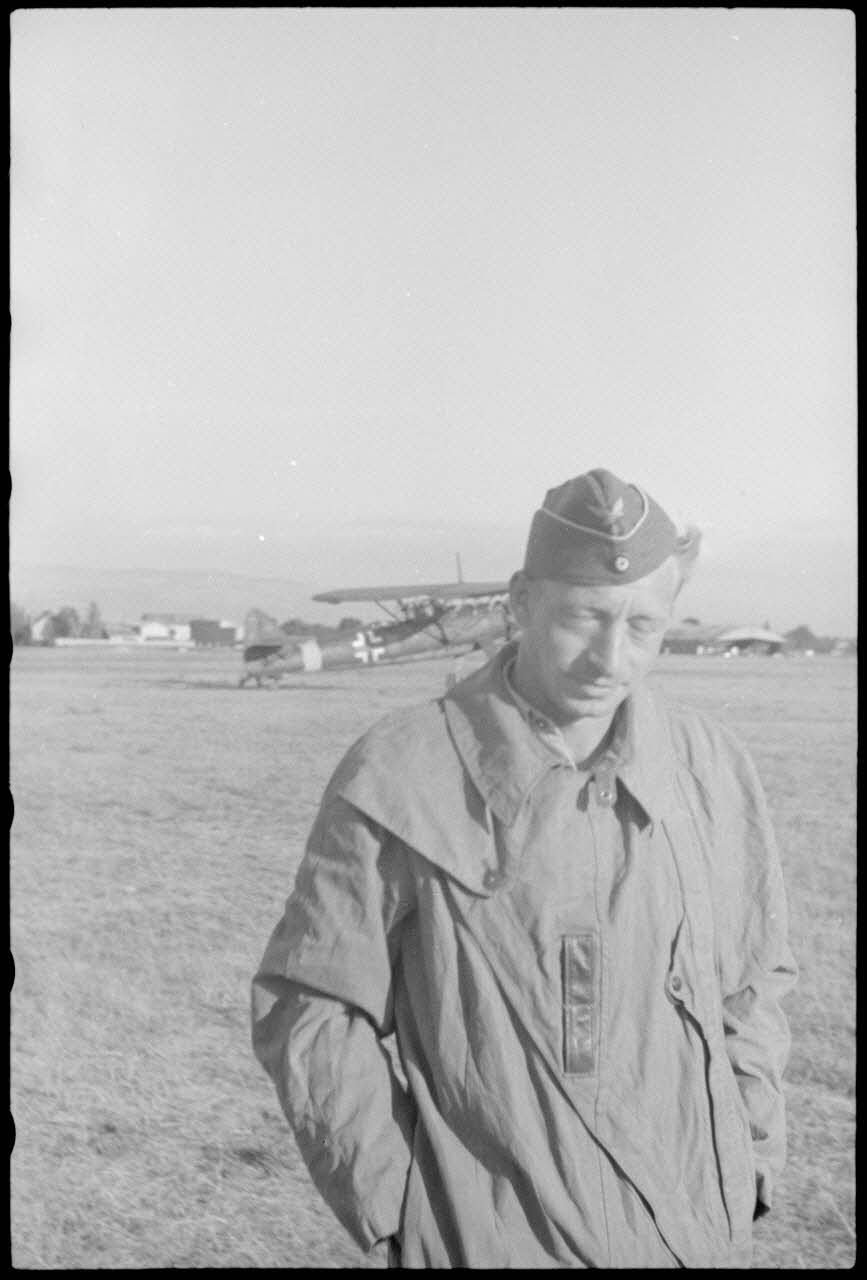 Sur terrain de Valence occupé par le Luftlandegeschwader 1, un officier de l'unité aéroportée observe le retour des avions après un exercice.