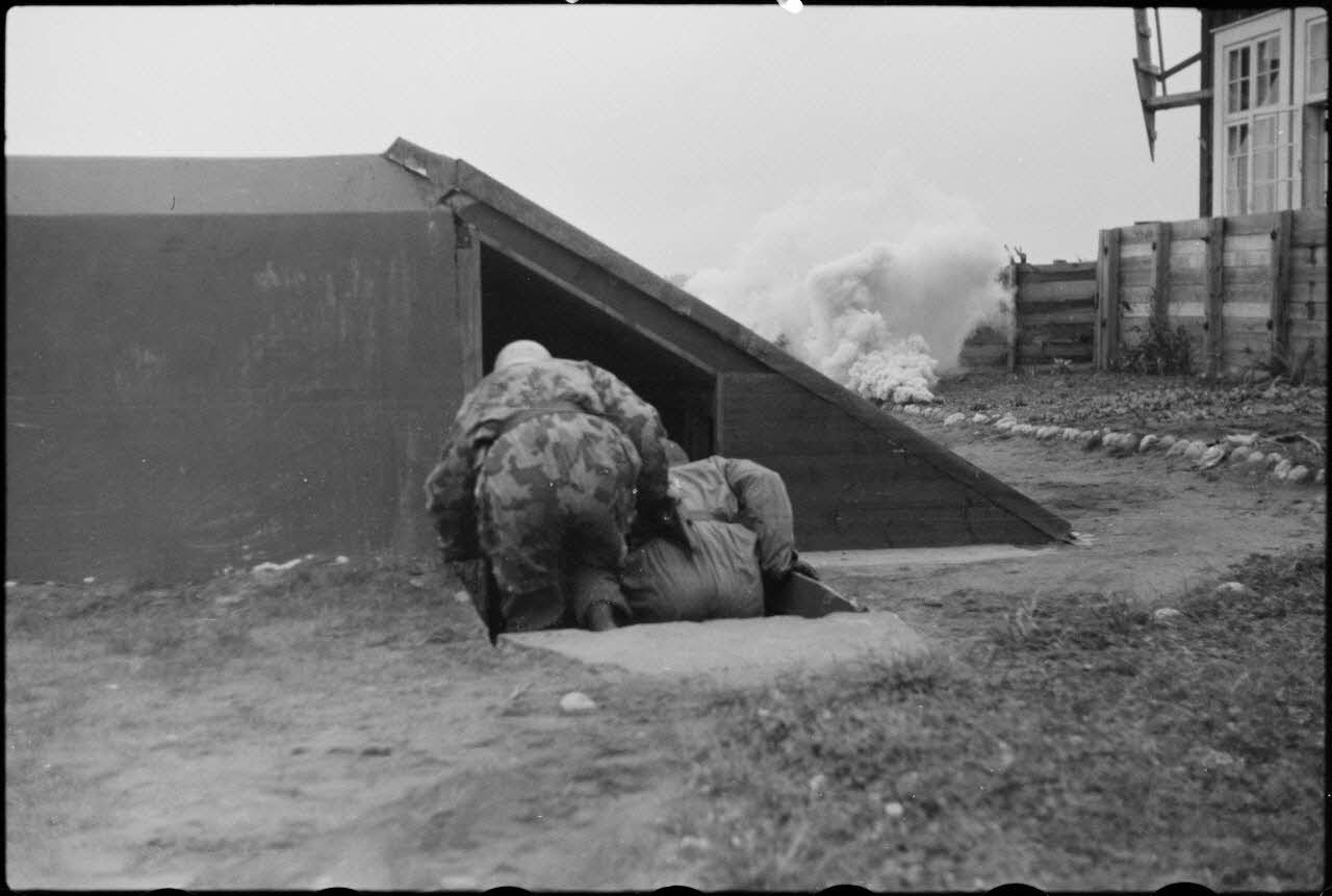 Sur un aérodrome norvégien, des parachutistes allemands (Fallschirmjäger) viennent de prendre le contrôle d'un blockhaus lors d'un exercice aéroporté du Luftlandegeschwader 1 (8./LGG1).