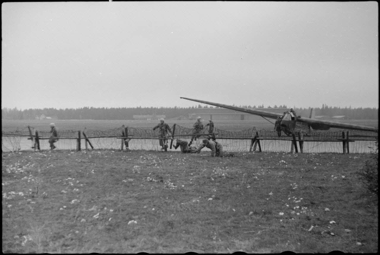 Sur un aérodrome norvégien, peu avant un exercice aéroporté, des parachutistes allemands (Fallschirmjäger) autour d'un planeur DFS-230 du Luftlandegeschwader 1 (8./LGG1).