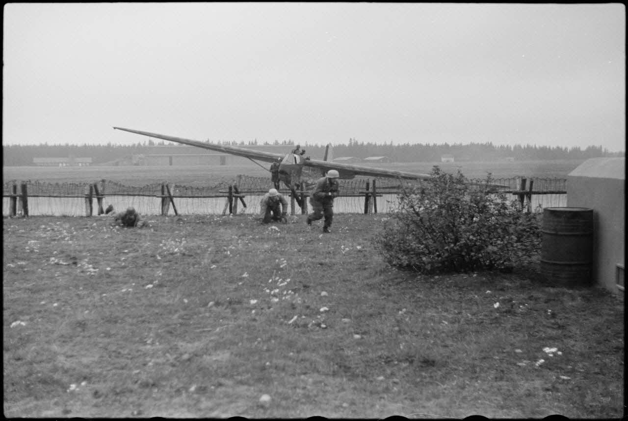 Sur un aérodrome norvégien, des parachutistes allemands (Fallschirmjäger) viennent de prendre le contrôle d'un blockhaus lors d'un exercice aéroporté du Luftlandegeschwader 1 (8./LGG1).