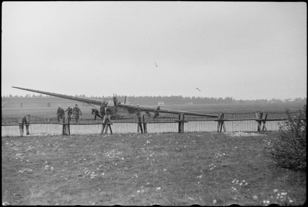 Sur un aérodrome norvégien, peu avant un exercice aéroporté, des parachutistes allemands (Fallschirmjäger) autour d'un planeur DFS-230 du Luftlandegeschwader 1 (8./LGG1).