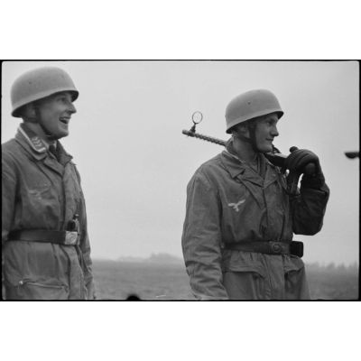 Deux parachutistes allemands peu avant un exercice de troupes aéroportées du Luftlandegeschwader 1 (8./LGG1) sur un aérodrome norvégien.