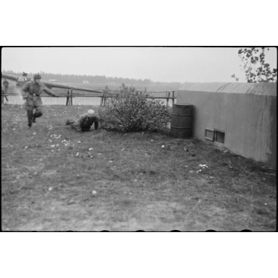 Sur un aérodrome norvégien, des parachutistes allemands (Fallschirmjäger) viennent de prendre le contrôle d'un blockhaus lors d'un exercice aéroporté du Luftlandegeschwader 1 (8./LGG1).