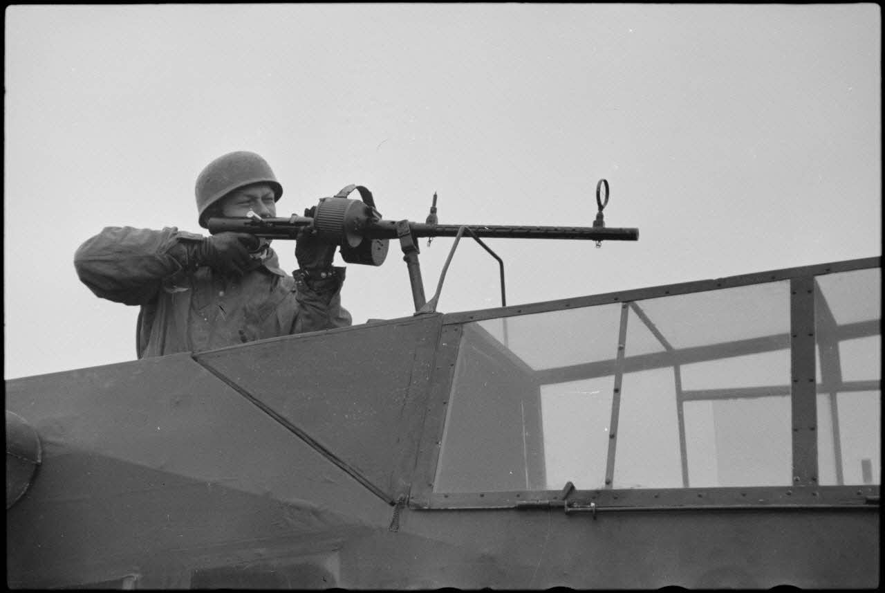 Sur un aérodrome norvégien, un parachutiste allemand (Fallschirmjäger) doté d'une mitrailleuse MG-15 peu avant un exercice de troupes aéroportées du Luftlandegeschwader 1 (8./LGG1).