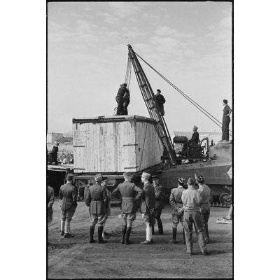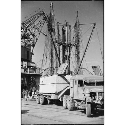 Déchargement d'une caisse de matériel américain, destiné aux troupes françaises, par une grue improvisée montée sur un char Sherman dans le port de Casablanca.