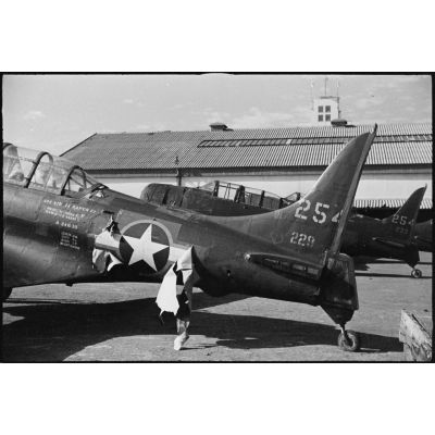Empennage d'un Douglas SBD Dauntless américain destiné aux troupes françaises sur un quai du port de Casablanca.