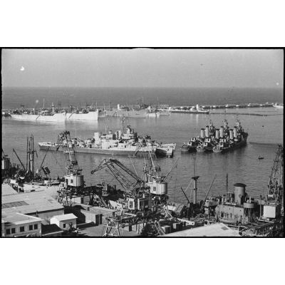 Vue du port de Casablanca : Liberty ships à quai et au déchargement.