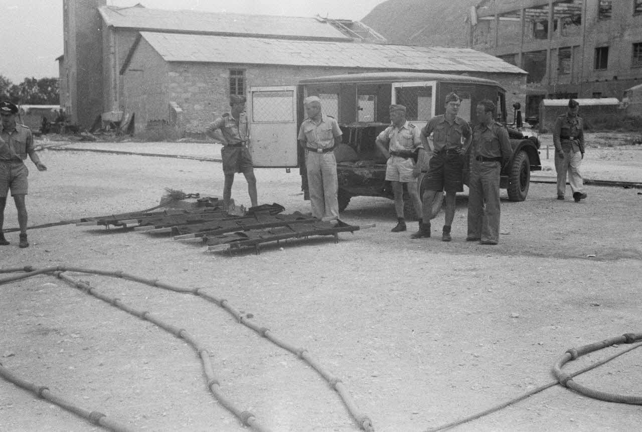 Entre Derna (Libye) et Maleme (Crète), des avions Junkers Ju-52 d'une unité de transport viennent de subir une attaque de chasseurs britanniques, 7 Junkers Ju-52 ont été détruits.Un équipage du de la 7e unité de sauvetage en mer (Seenotstaffel 7) équipé d'hydravions Dornier Do-24 est venu à son secours. A Juda (lieu précisé dans la légende d'origine), une équipe sanitaire du service de santé de la Luftwaffe patiente avant l'arrivée du Dornier. L'hydravion arrive, les blessés sont déchargés et placés sur une civière puis dans une ambulance.