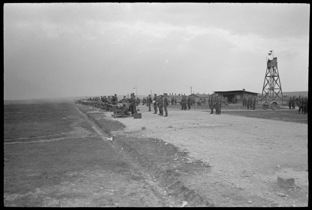 Sur un terrain d'aviation, la formation aux canons de DCA de 2 cm FlaK de jeunes artilleurs du Reichsarbeitdienst (RAD).
