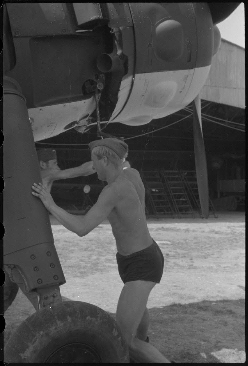 Sur un terrain d'aviation occupé par la 1re escadre aéroportée (Luftlandegeschwader 1), deux mécaniciens de piste démarent le moteur Bramo 323 d'un Henschel Hs-126.