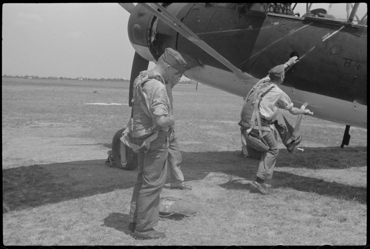 Un pilote de la 1re escadrille aéroportée (Luftlandegeschwader 1) s'apprête à monter à bord d'un Henschel Hs-126 dans la Drôme.