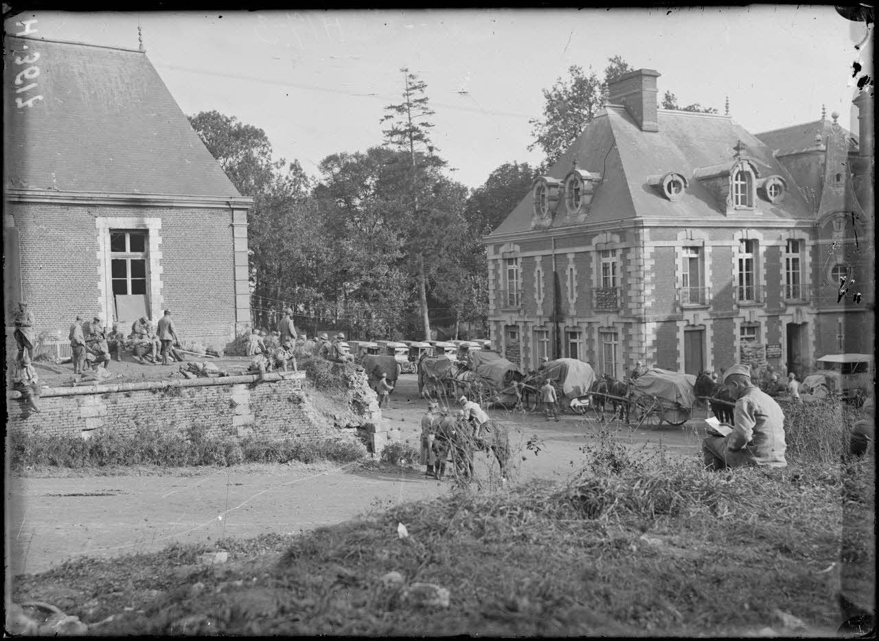 Dans le parc du château de Suzanne, les hommes du 171e RI (régiment d'infanterie) se reposent avant de monter aux premières lignes et les chevaux vont à l'abreuvoir. (photos 3620, 3621 et 3622)