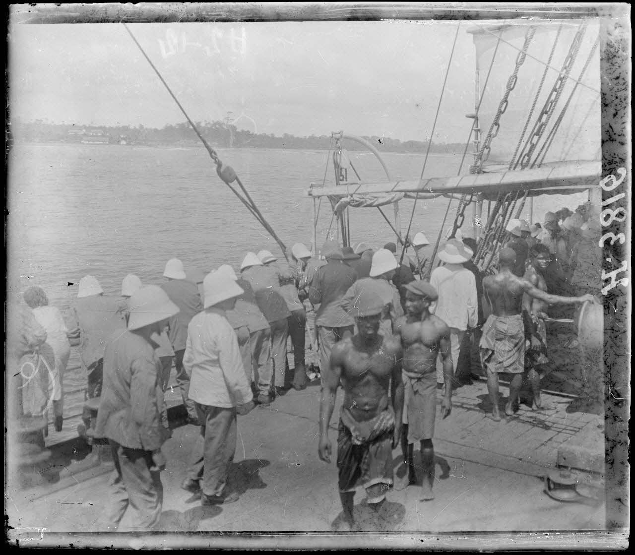 Lors de l'escale de Tabou, des équipages de Kroumen rejoignent le navire à bord de plusieurs barques.