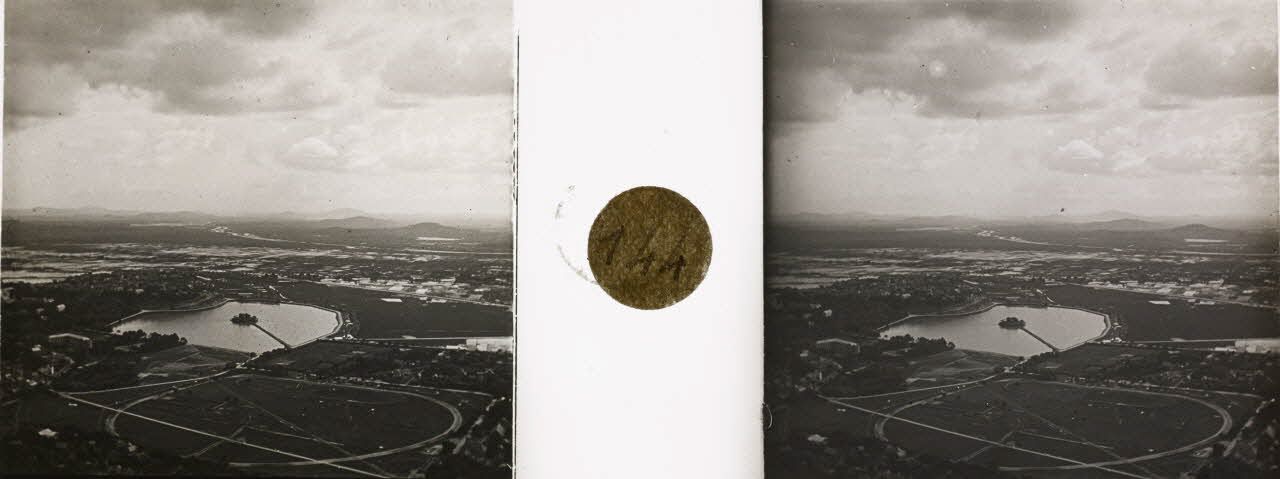 D68-11. Avant la colonisation, l'île de Madagascar était divisée en plusieurs royaumes concurrents. Tananarive, capitale du royaume merina depuis le XVIIe siècle, est une ville de 3 kilomètres carrés. Construite sur un massif qui domine la plaine environnante de 150 mètres, elle bénéficie d'une position défensive stratégique. René Denis photographie ici la capitale malgache depuis les plus hauts sites de la ville : le poste optique et le Palais de la Reine. Depuis ce monument, on aperçoit notamment le Palais du Premier ministre, la rivière Ikopa, le lac Anosy et la plaine de Mahamasina.