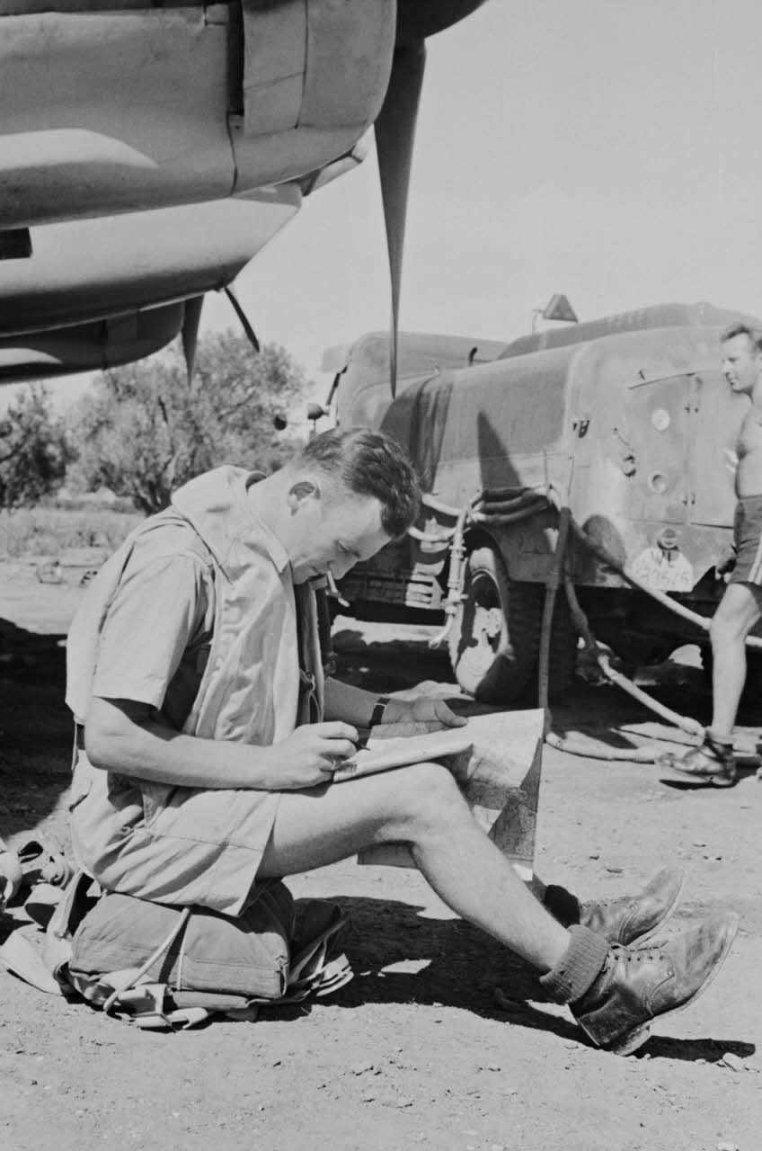 Tandis qu'un membre de l'équipage étudie la plan de vol sur une carte, le camion-citerne apporte le précieux ravitaillement en essence.