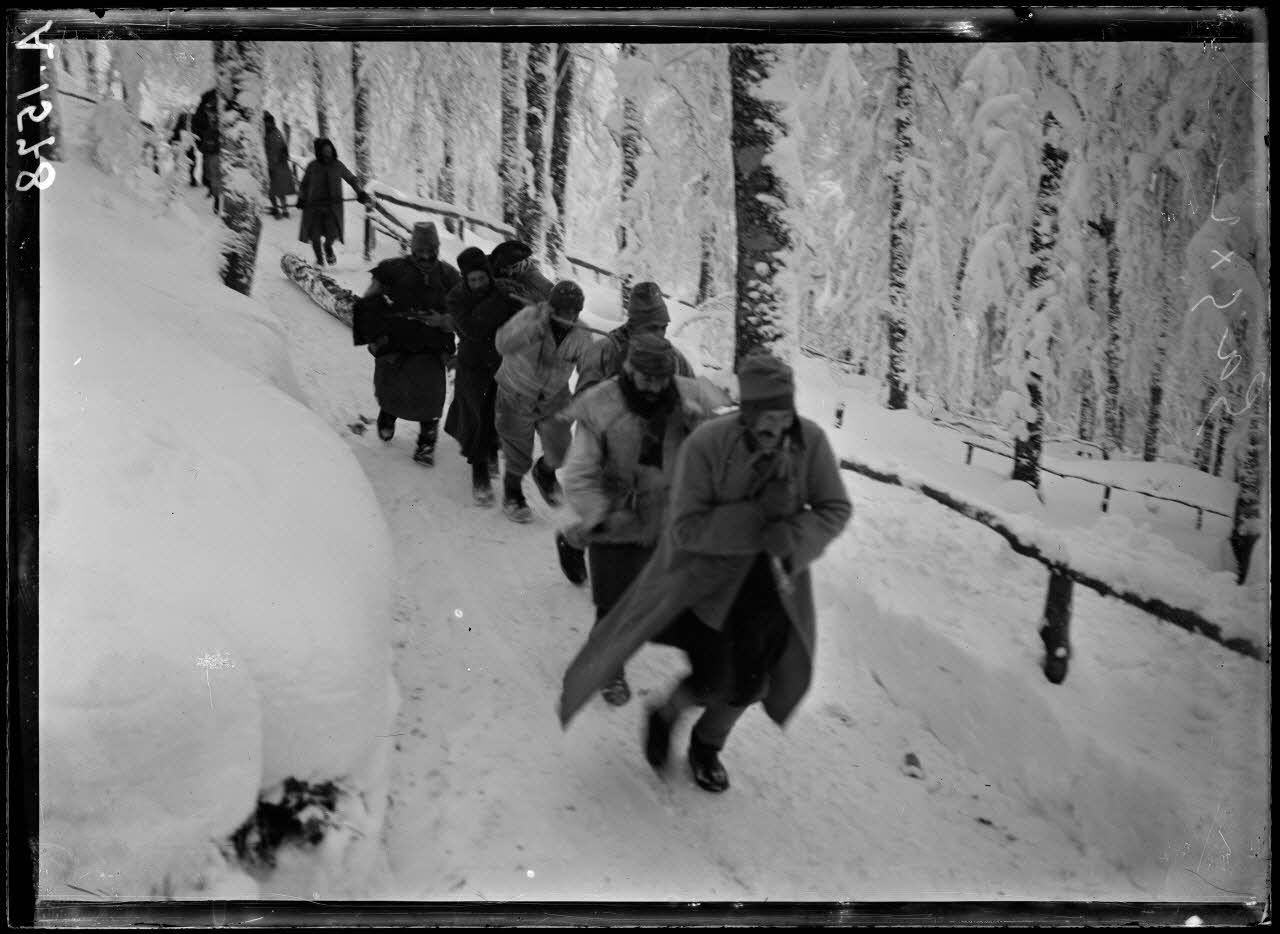 - Vues du camp installé au Tanet : camp, soldats, repos, repas, sentinelles, vie quotidienne, canons de 155 mm long, skieurs, traîneaux et chiens, convois, cuisine roulante.