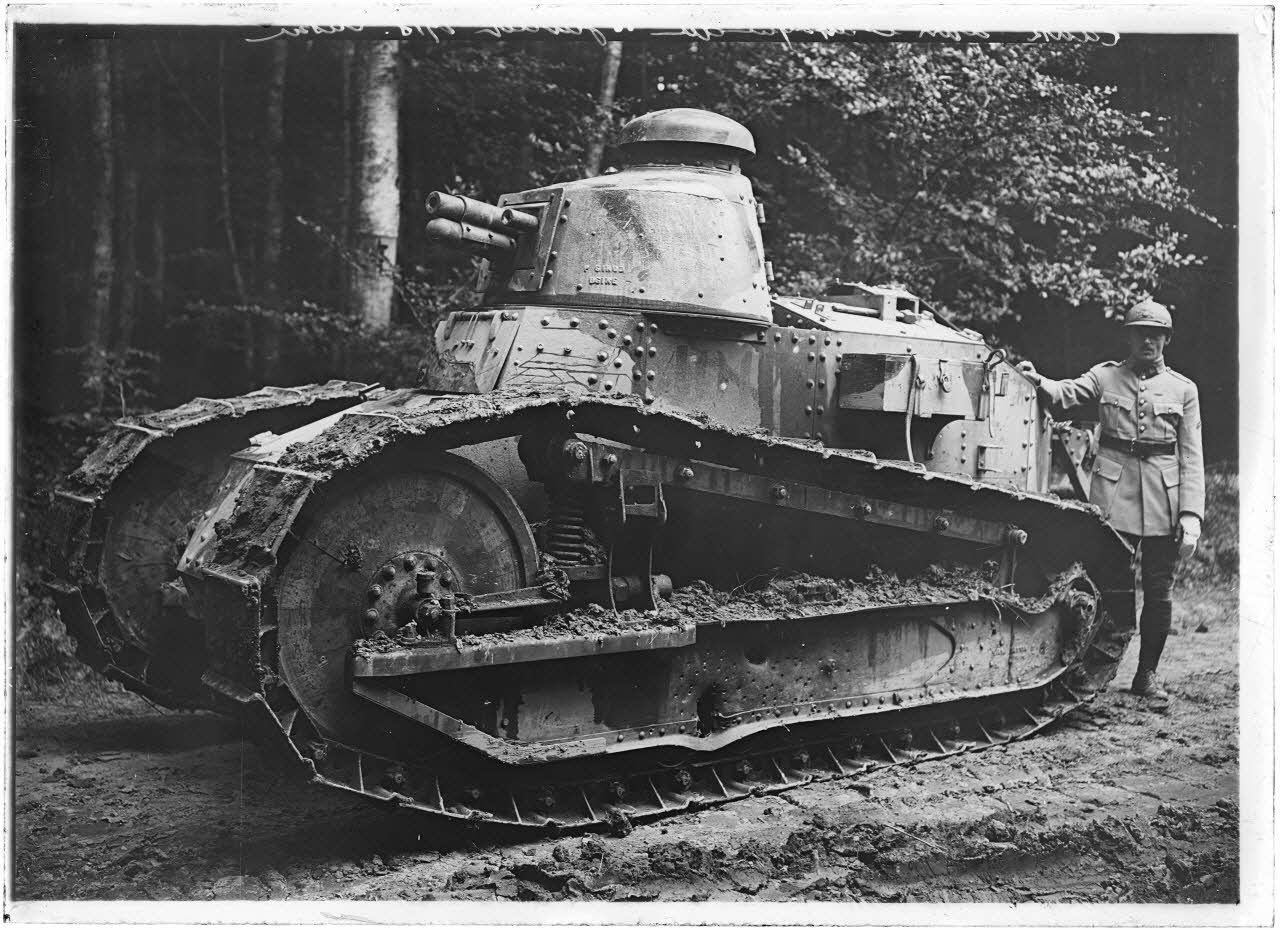 Char Renault FT de profil. Légende extraite du volume " 1914-1919, La Guerre, 150 planches artistiques de la Collection Personnelle du Commandant Tournassoud, ex-Directeur du Service Photographique et Cinématographique de Guerre. Préface autographe du Maréchal Pétain ", Service Commercial et de Vente Argence & Vidal, Lyon, 1920, planche 55.