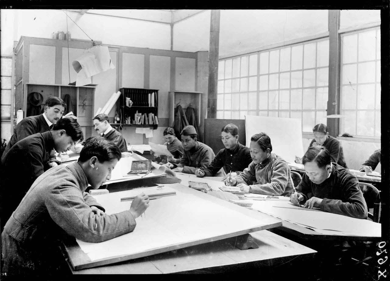 Tarbes (Hautes-Pyrénées). Les Annamites à l'arsenal. Bureau des études pour obus de 155 mm. [légende d'origine]