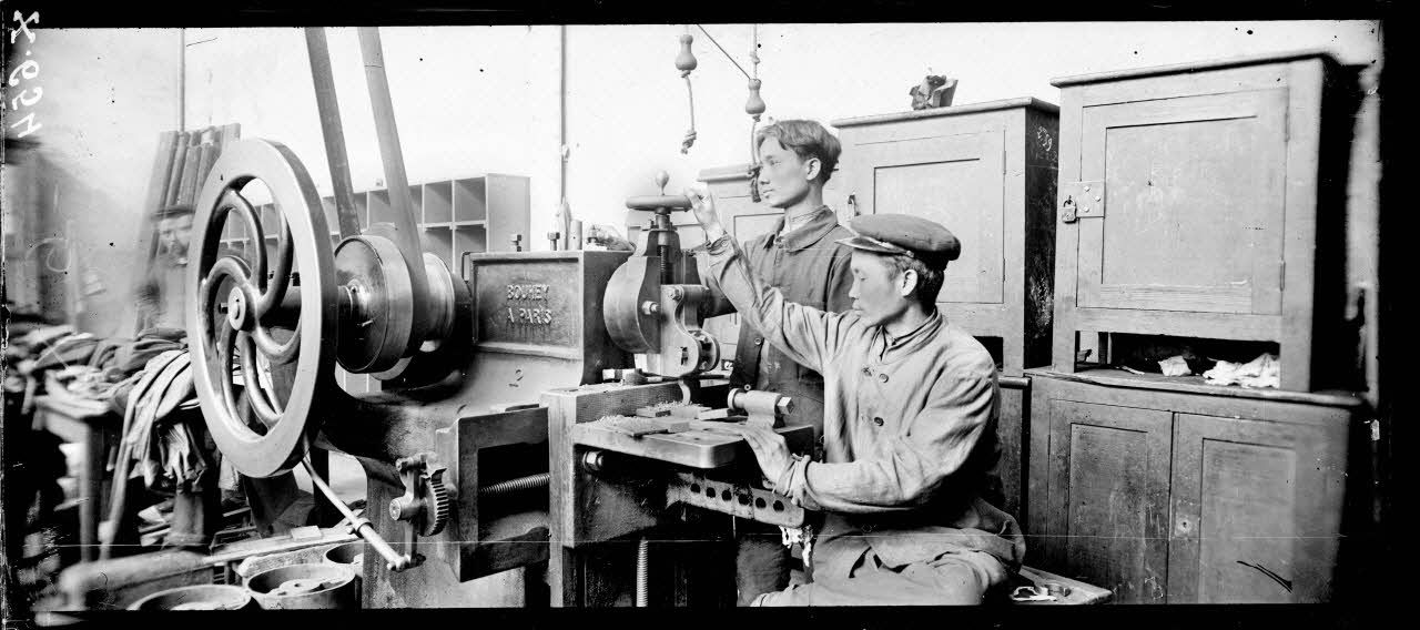 Tarbes (Hautes-Pyrénées). Les Annamites à l'arsenal. Etau limeur et son aide. [légende d'origine]