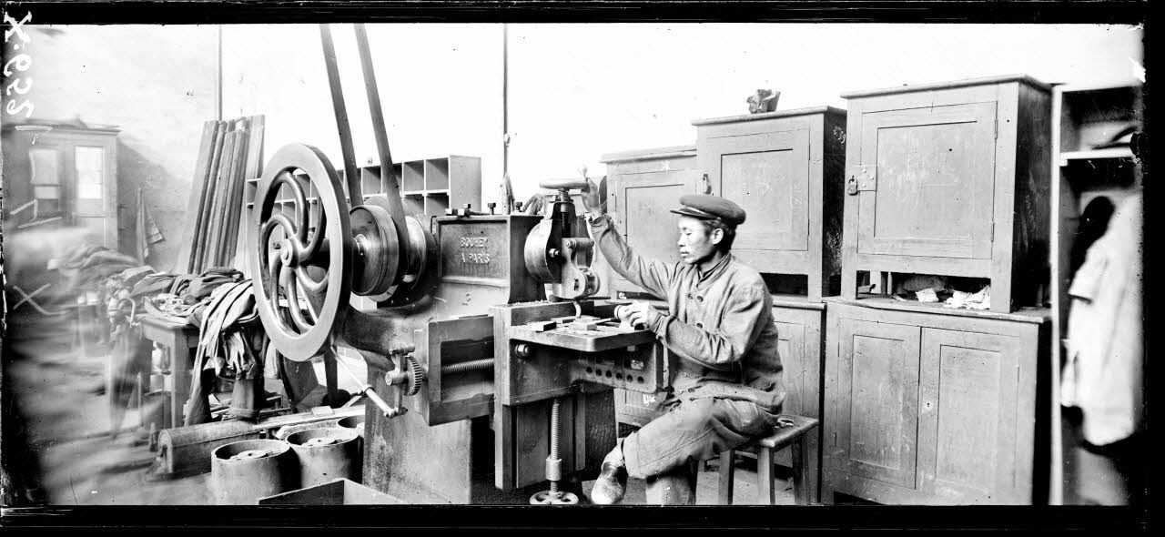 Tarbes (Hautes-Pyrénées). Les Annamites à l'arsenal. Etau limeur. [légende d'origine]