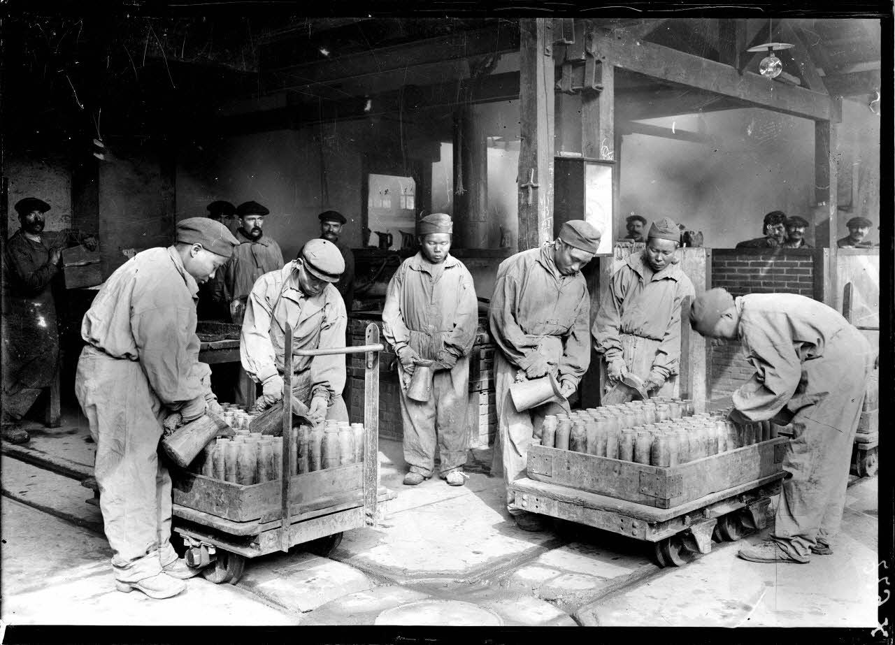 Ouvriers annamites au travail à l'arsenal de Tarbes en avril 1916.
