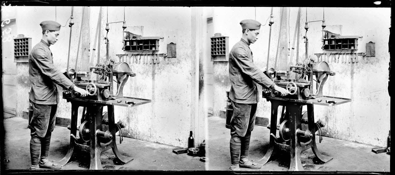 Tarbes (Hautes-Pyrénées). Les Annamites à l'arsenal. Etau limeur et son aide.