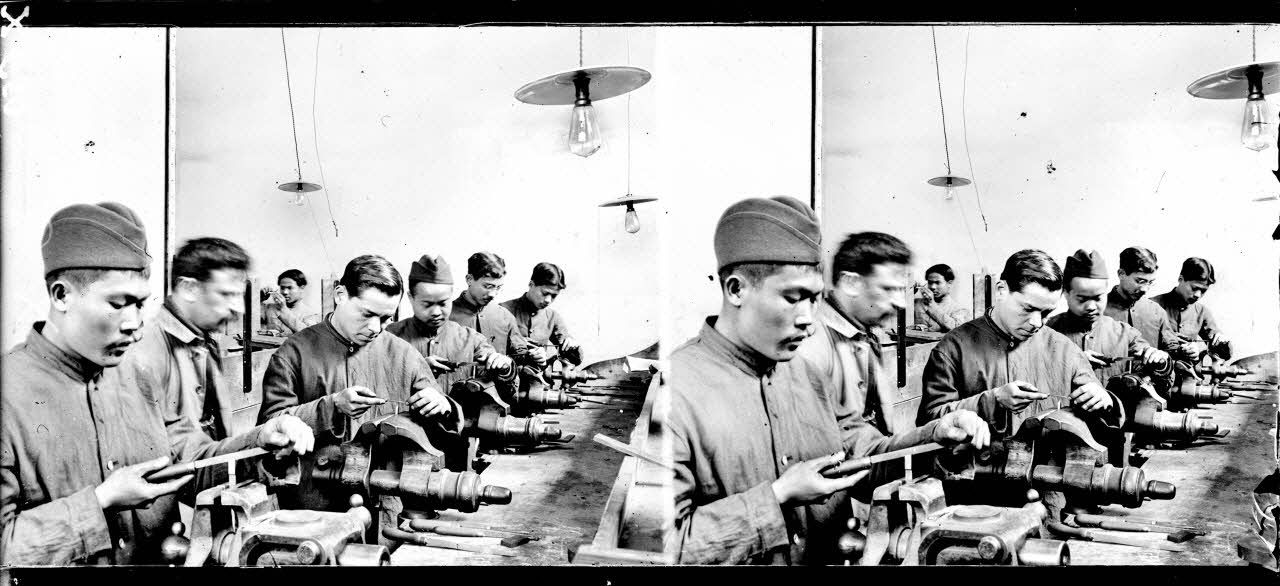 Ouvriers annamites au travail à l'arsenal de Tarbes en avril 1916.