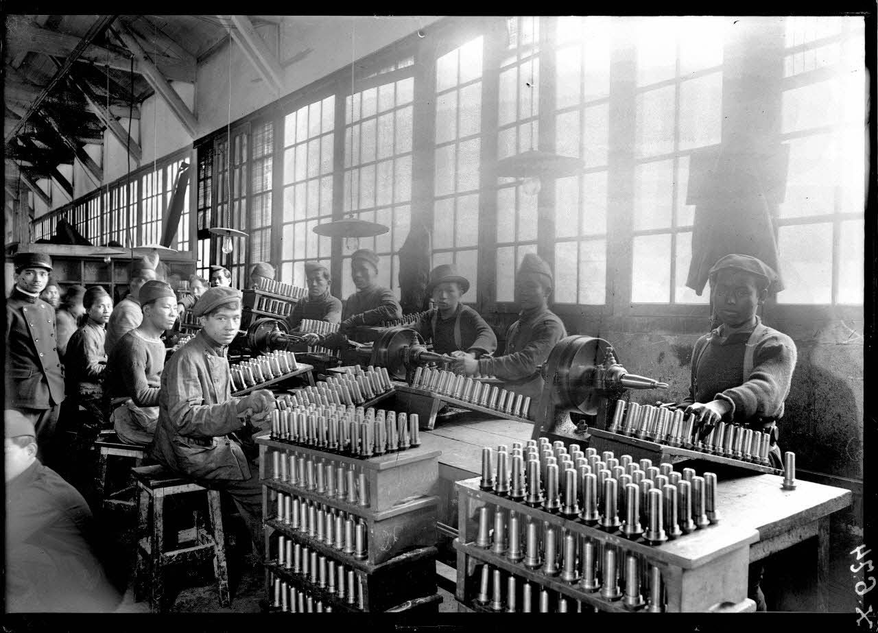 Ouvriers annamites au travail à l'arsenal de Tarbes en avril 1916.