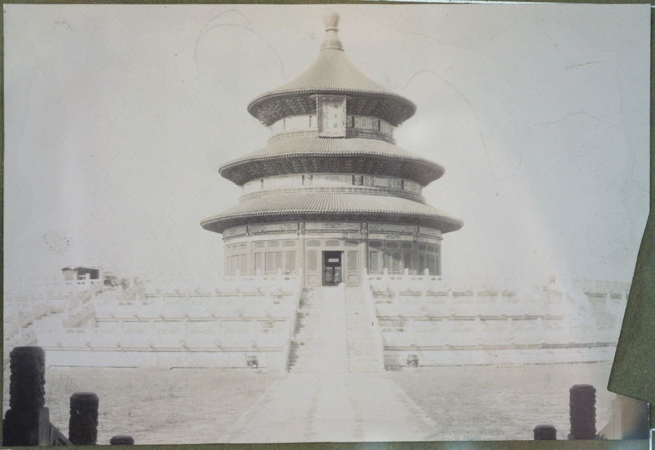 Temple du Ciel à Pékin. Monument à triple toiture bâti par l'empereur Young-Lo, de la dynastie des Ming, situé dans la partie nord du parc du Temple. L'Empereur se rend annuellement trois fois dans ce temple pour communiquer au Ciel, dont il est le fils, le résultat de la gestion de son empire. Aucune idole ne s'y trouve, on y transporte la Tablette du Ciel lors des visites impériales. [légende d'origine]