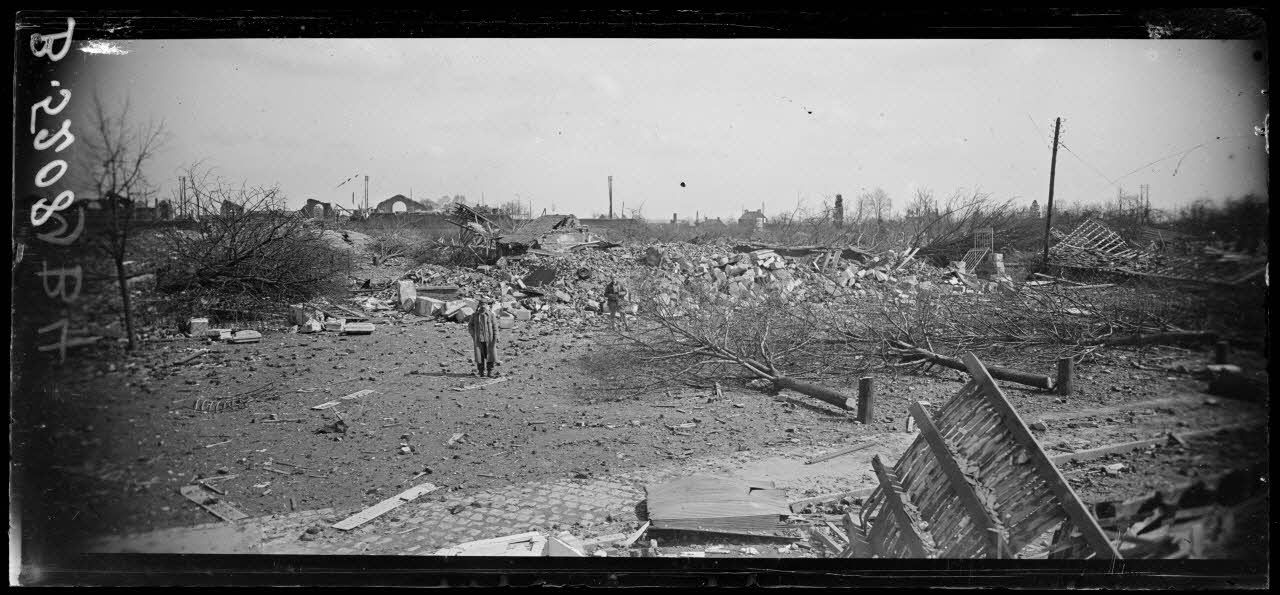 L'opérateur photographie les anciennes lignes allemandes avec leurs abris bétonnés et leurs anciensdépôts de munitions, des villages plus ou moins rasés, un château et des batiments publics dynamités, des routes détruites par les explosions de mines, des églises bombardées, aux orgues desquelles les tuyaux ont été arrachés et emportés, des ponts effondrés, des usines rendues inutilisables, des terrains agricoles inondés, des vergers aux arbres sciés, un cimetière dont les Allemands ont fait sauter les tombes.