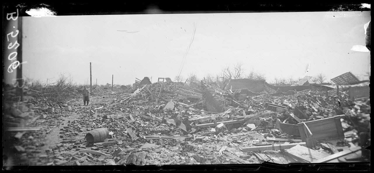 L'opérateur photographie les anciennes lignes allemandes avec leurs abris bétonnés et leurs anciensdépôts de munitions, des villages plus ou moins rasés, un château et des batiments publics dynamités, des routes détruites par les explosions de mines, des églises bombardées, aux orgues desquelles les tuyaux ont été arrachés et emportés, des ponts effondrés, des usines rendues inutilisables, des terrains agricoles inondés, des vergers aux arbres sciés, un cimetière dont les Allemands ont fait sauter les tombes.