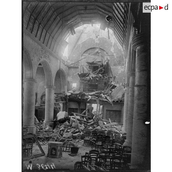 - A Rethonvillers, l'église, où un poste d'observation était installé, domine un village dévasté. Dans les rues, les arbres ont été coupés par les troupes allemands ;