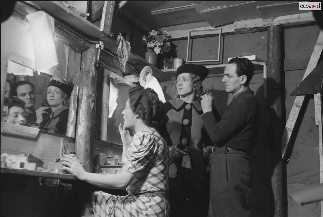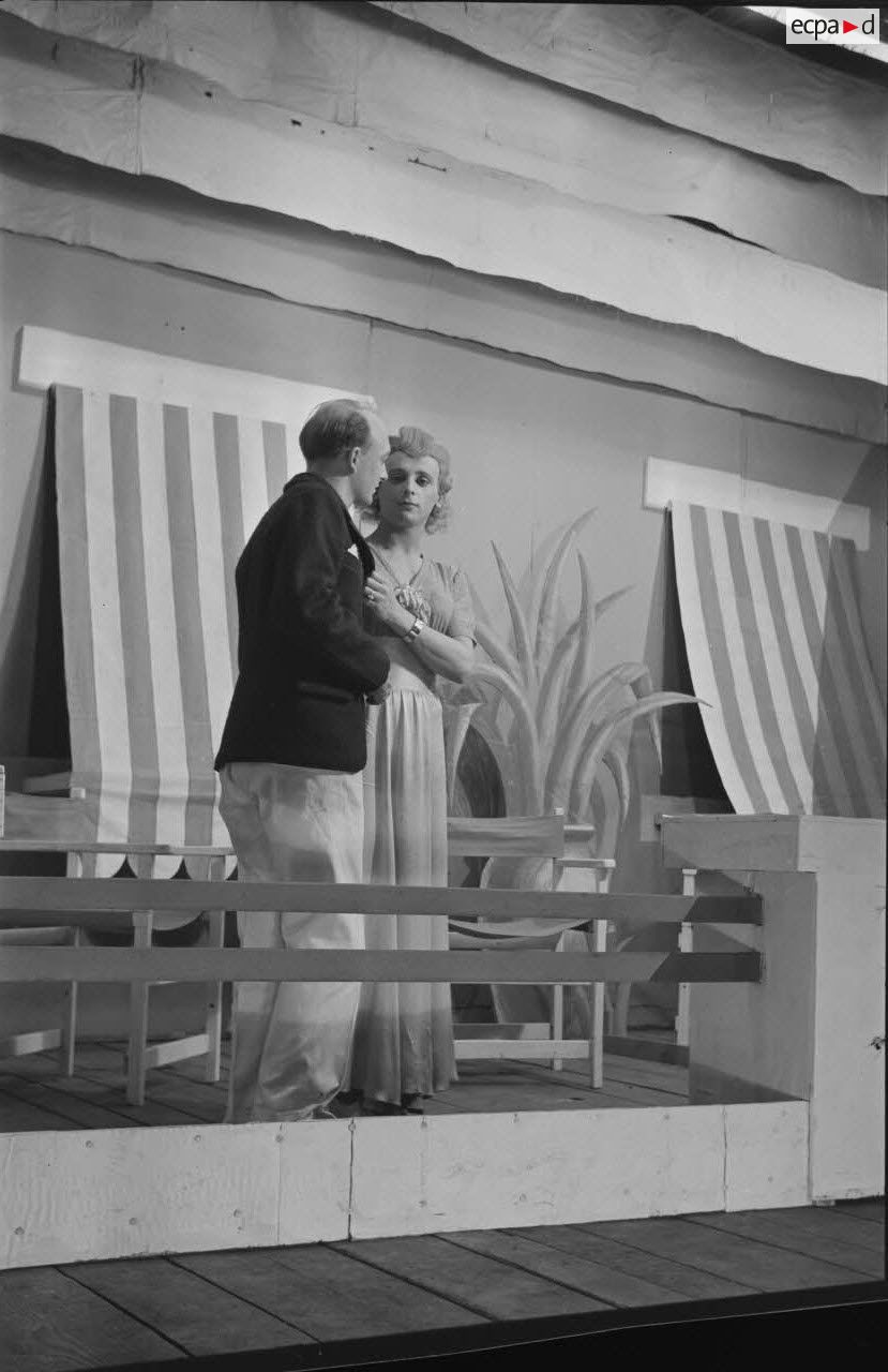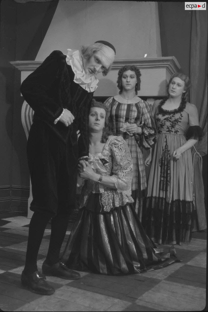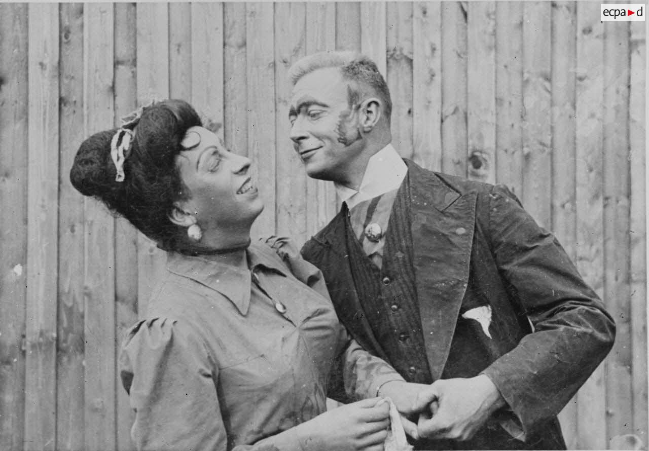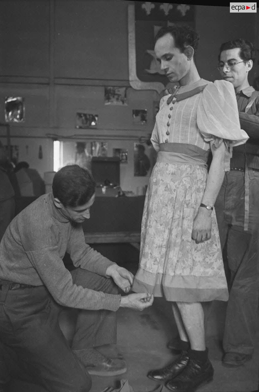 Les comédiens qui se grimaient en femme renouaient ainsi avec une longue tradition remontant au moins à l’Antiquité gréco-romaine. Les femmes ayant longtemps été interdites de jouer au théâtre, les comédiens occidentaux avaient pris l’habitude de se travestir, et ce jusqu’au théâtre élisabéthain du XVIIe siècle. Le travestissement est parfois fait avec beaucoup de réalisme, comme dans cette scène pleine de tendresse de Marius de Marcel Pagnol ou bien dans Le Noël sur la place ou les Enfances de Jésus de Henri Ghéon. D’autres prestations prêtent sans doute davantage à sourire, comme le souligne le photographe avec cette légende pleine d’humour : « L'habilleuse est en kaki, et la vedette a de grands pieds ! »