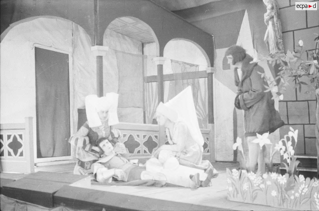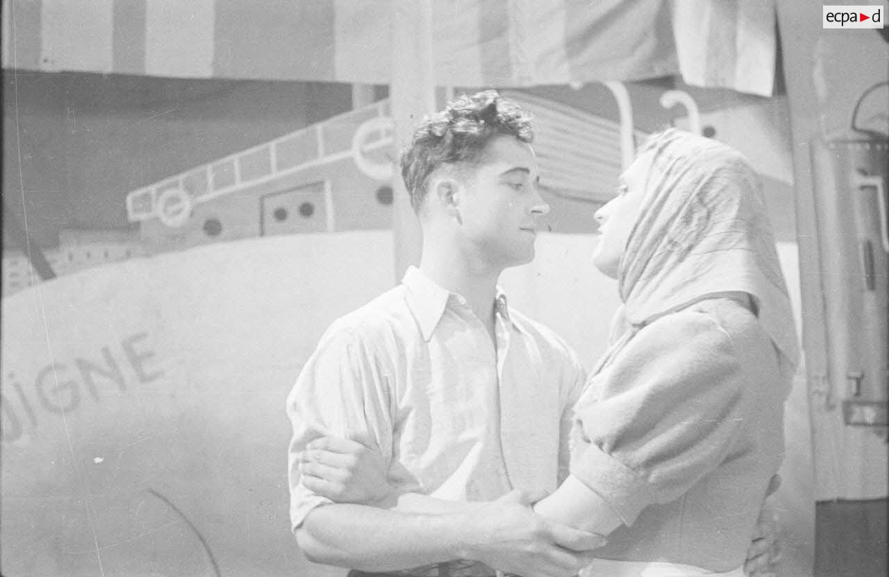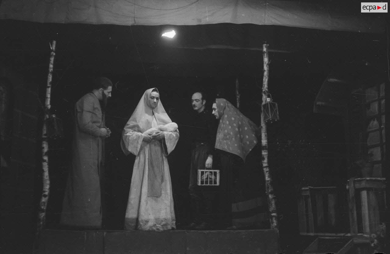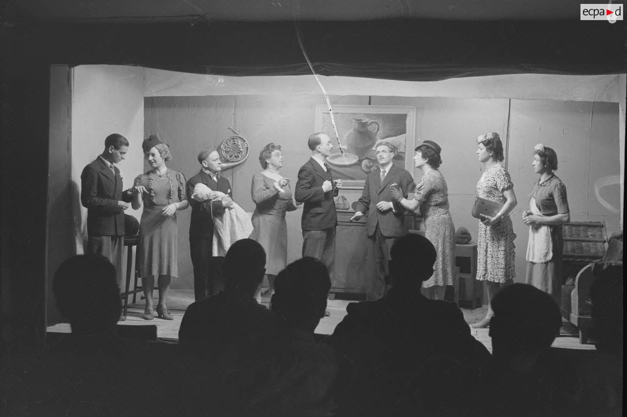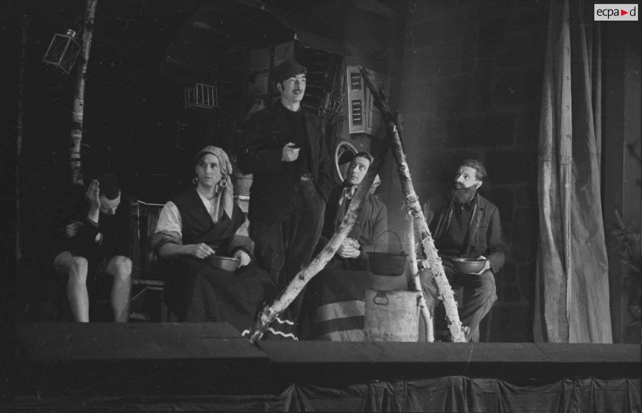 Les comédiens qui se grimaient en femme renouaient ainsi avec une longue tradition remontant au moins à l’Antiquité gréco-romaine. Les femmes ayant longtemps été interdites de jouer au théâtre, les comédiens occidentaux avaient pris l’habitude de se travestir, et ce jusqu’au théâtre élisabéthain du XVIIe siècle. Le travestissement est parfois fait avec beaucoup de réalisme, comme dans cette scène pleine de tendresse de Marius de Marcel Pagnol ou bien dans Le Noël sur la place ou les Enfances de Jésus de Henri Ghéon. D’autres prestations prêtent sans doute davantage à sourire, comme le souligne le photographe avec cette légende pleine d’humour : « L'habilleuse est en kaki, et la vedette a de grands pieds ! »
