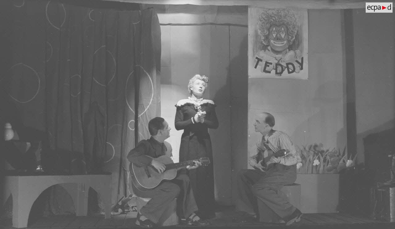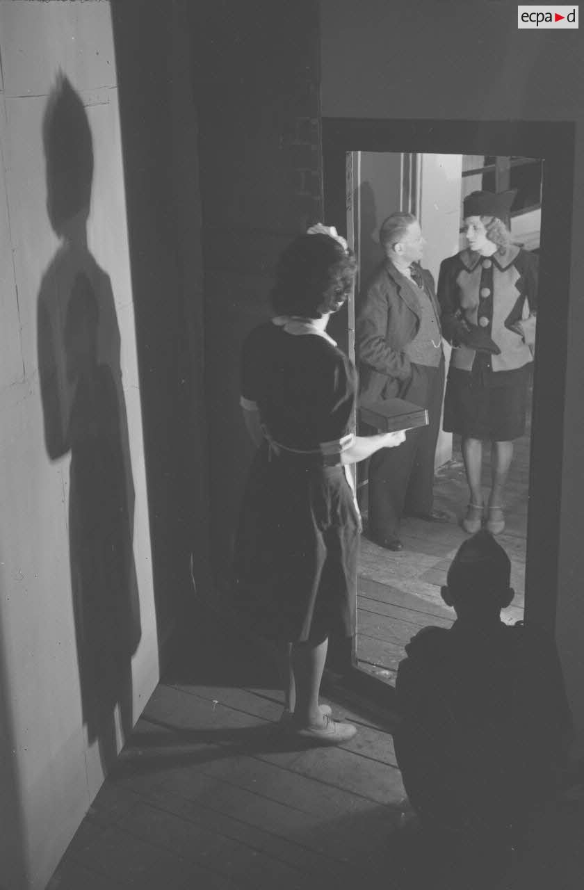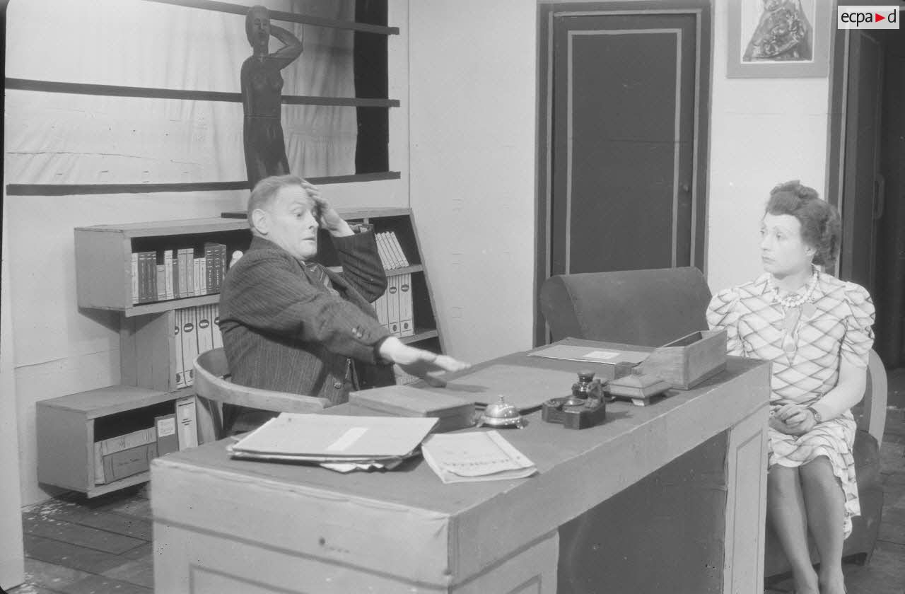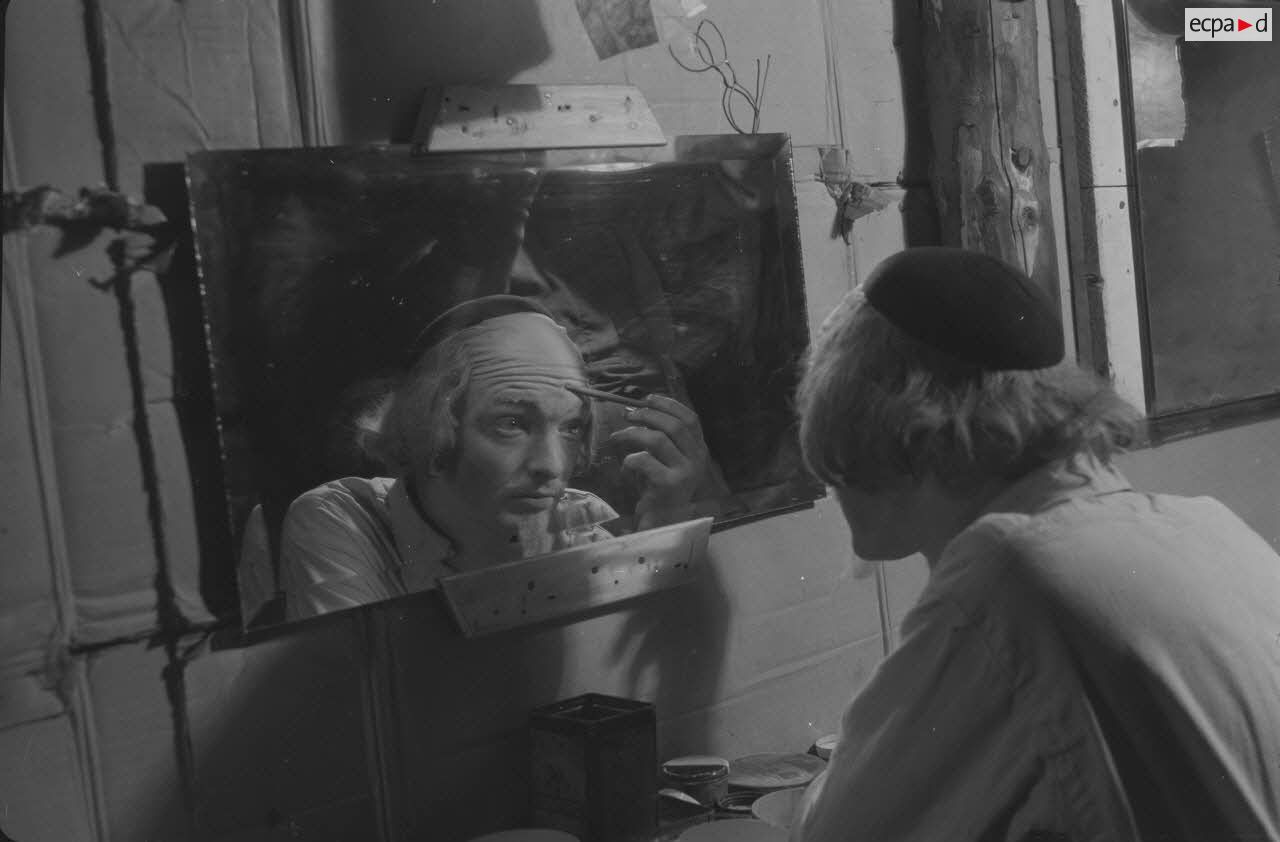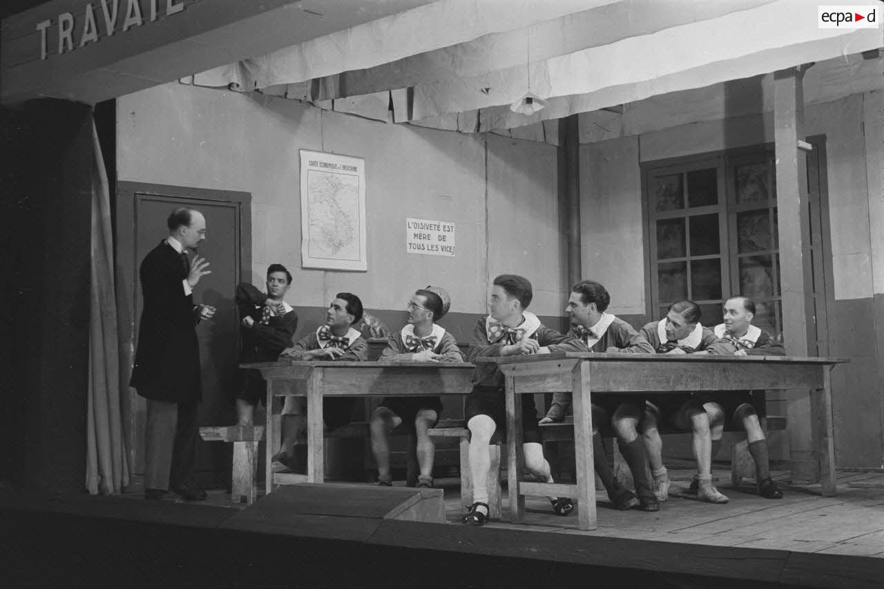 Les comédiens qui se grimaient en femme renouaient ainsi avec une longue tradition remontant au moins à l’Antiquité gréco-romaine. Les femmes ayant longtemps été interdites de jouer au théâtre, les comédiens occidentaux avaient pris l’habitude de se travestir, et ce jusqu’au théâtre élisabéthain du XVIIe siècle. Le travestissement est parfois fait avec beaucoup de réalisme, comme dans cette scène pleine de tendresse de Marius de Marcel Pagnol ou bien dans Le Noël sur la place ou les Enfances de Jésus de Henri Ghéon. D’autres prestations prêtent sans doute davantage à sourire, comme le souligne le photographe avec cette légende pleine d’humour : « L'habilleuse est en kaki, et la vedette a de grands pieds ! »