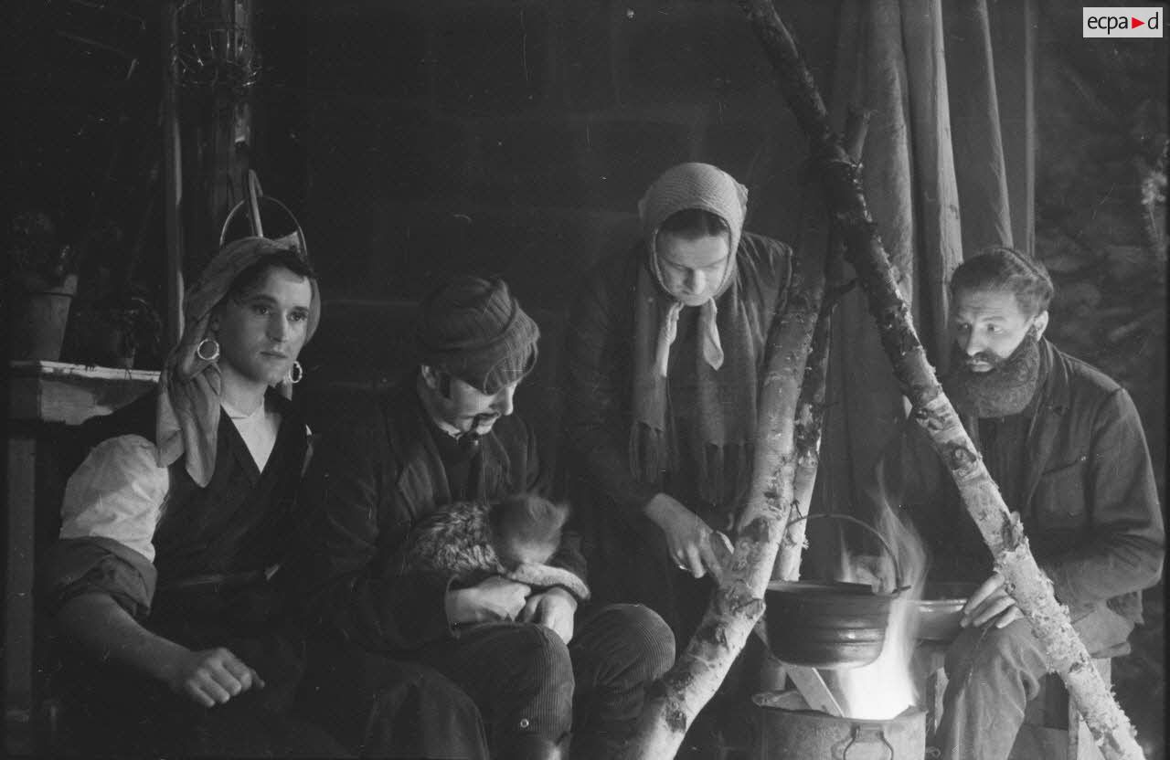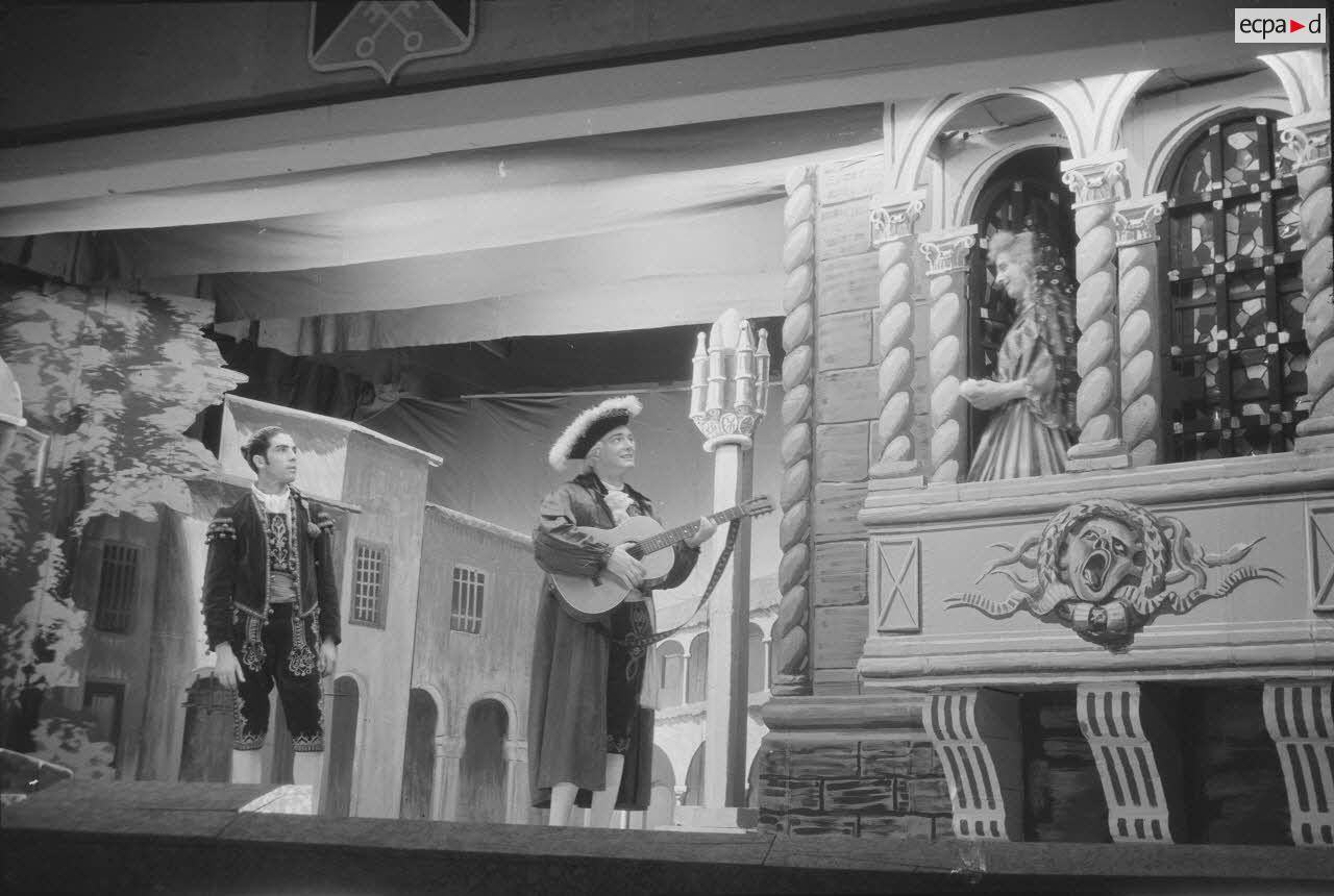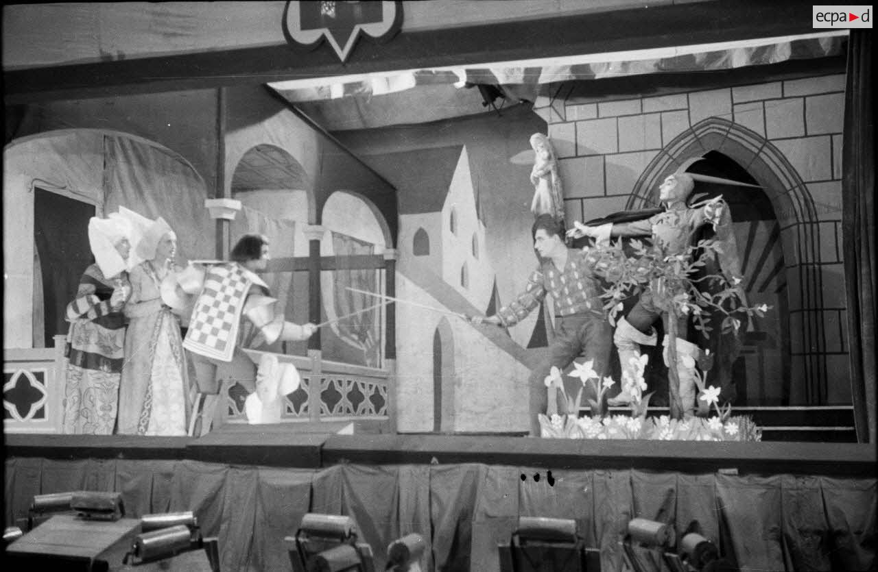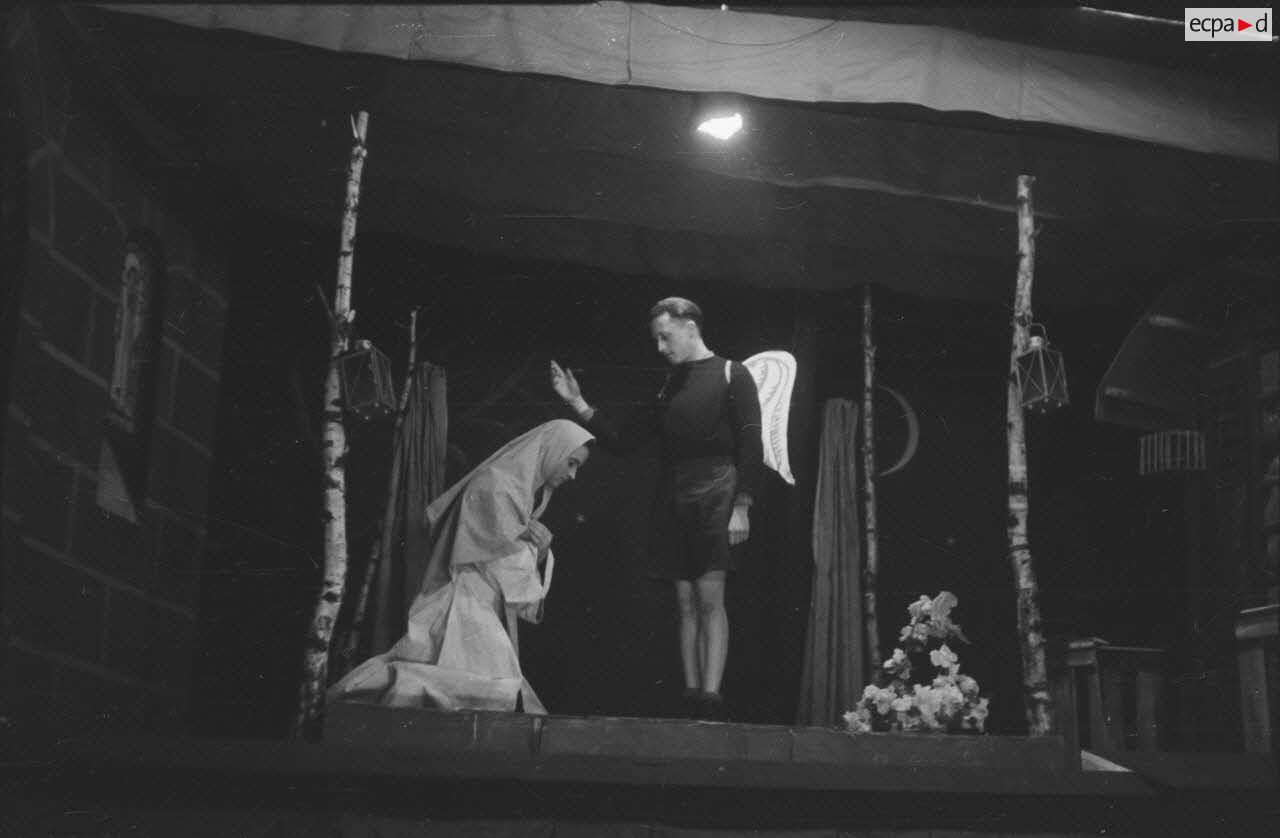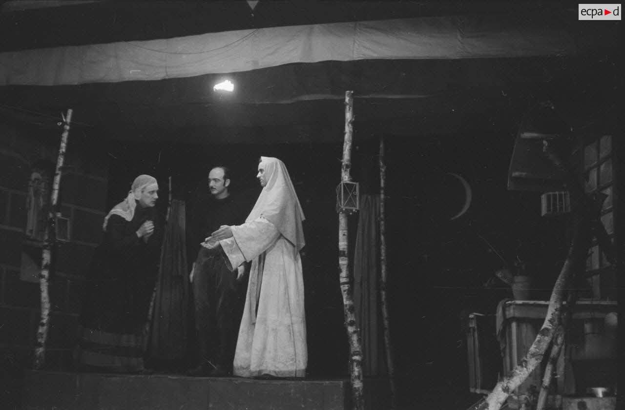 Les comédiens qui se grimaient en femme renouaient ainsi avec une longue tradition remontant au moins à l’Antiquité gréco-romaine. Les femmes ayant longtemps été interdites de jouer au théâtre, les comédiens occidentaux avaient pris l’habitude de se travestir, et ce jusqu’au théâtre élisabéthain du XVIIe siècle. Le travestissement est parfois fait avec beaucoup de réalisme, comme dans cette scène pleine de tendresse de Marius de Marcel Pagnol ou bien dans Le Noël sur la place ou les Enfances de Jésus de Henri Ghéon. D’autres prestations prêtent sans doute davantage à sourire, comme le souligne le photographe avec cette légende pleine d’humour : « L'habilleuse est en kaki, et la vedette a de grands pieds ! »