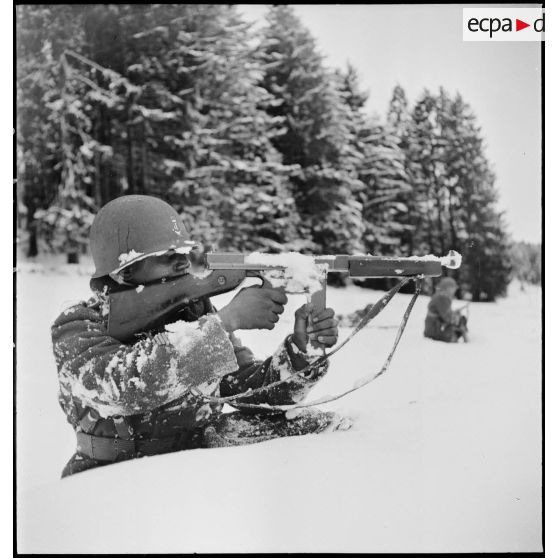 Des tirailleurs de la 9e DIC progressent ici dans la neige, armés de pistolets-mitrailleurs Thompson, de fusils-mitrailleurs Bren et de fusils Springfield M1903. Souffrant de la rigueur du climat de l'Est de la France, ces soldats d'Afrique noire sont progressivement relevés dans le cadre des opérations dites de blanchiment de l'armée.