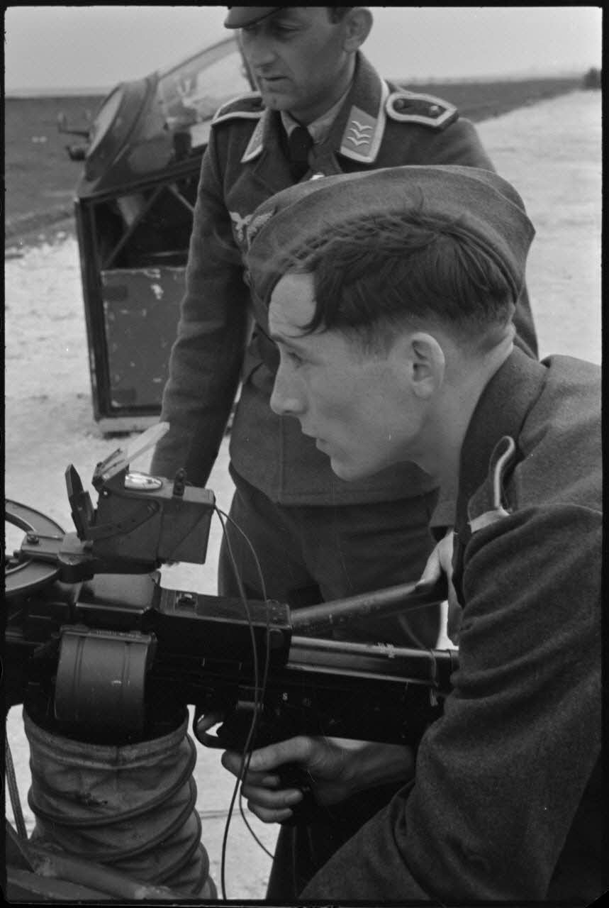 Le commandant (Major) Karl-Heinz Schomann I./LG1 (Lehrgeschwader 1) titulaire de la croix de chevalier de la croix de fer (Ritterkreuz) s'exerce au tir à la mitrailleuse.