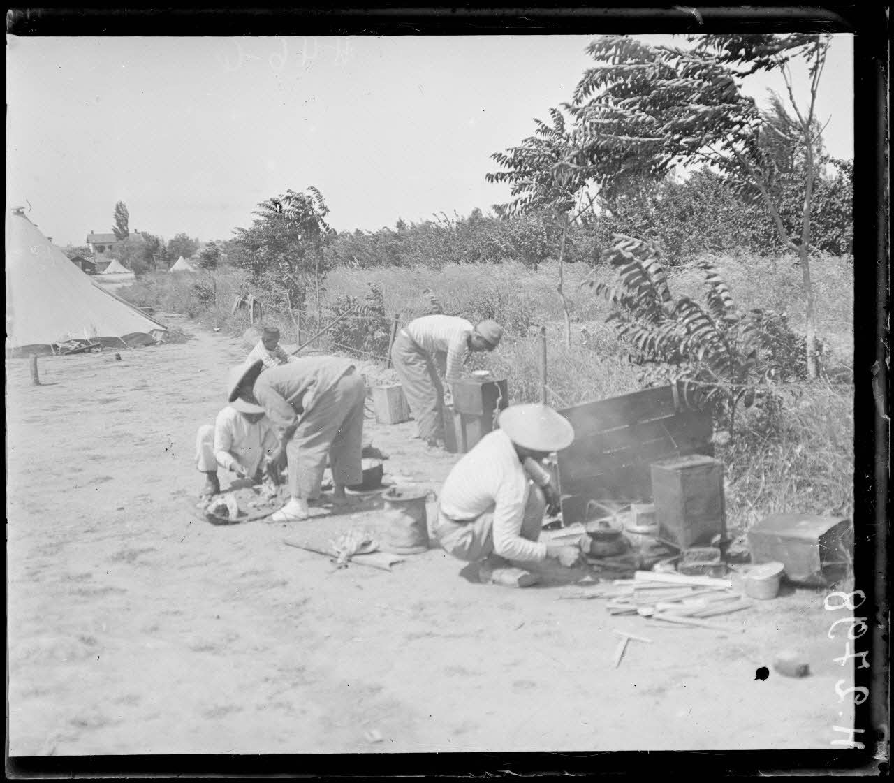 Le 31 mai, à la gare, des vivres sont distribuées près du magasin de matériel. Une fois passé au ravitaillement, le 1e BTA (bataillon de tirailleur annamite) prépare sa cuisine.