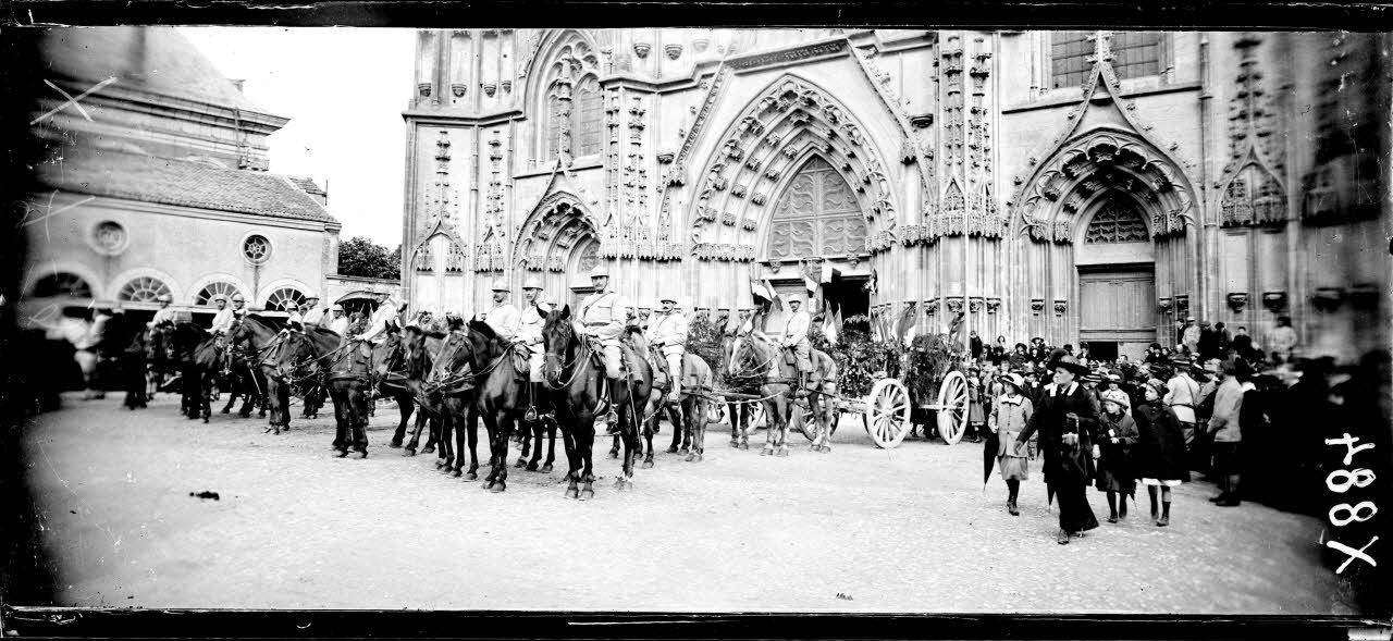 Toul (Meurthe-et-Moselle). Ancienne cathédrale Saint-Etienne. Obsèques des victimes d'un raid d'avions allemands sur la ville. Les prolonges d'artillerie devant l'église. [légende d'origine]