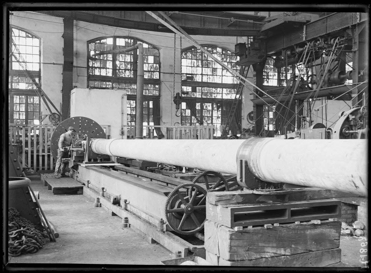 Dans l'atelier du Mourillon, une hélice de 6000 kg est ajustée sur un arbre à hélices. Une quille sert de support à l'arbre porte-hélices. Non loin d'une cale de construction, le "Regnault" est parqué sans son ballast. Des apprentis mécaniciens aident à l'ajustage et au contrôle des équipements et de l'armement. Une presse hydraulique sert à la coulée de bâtis d'obus. Les essais sur les obus sont effectués à 1400 kgn le culot est poinçonné à 30 tonnes, après le décapage et le graissage des munitions. Un contrôle géométrique des obus de 75 mm est réalisé.